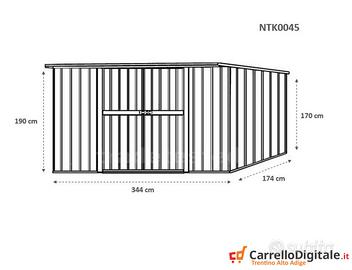 * Dimensioni esterne (incluso tetto): 3.45 m (Larghezza) x 1.86 m (Lunghezza) x