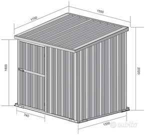 Box casetta 1.55 x 1.75 con spiovenza tetto in avanti, capanno in lamiera zincata da giardino o cantiere facile da montare grazie al manuale e il kit di montaggio comprensivo di tutta la ferramenta. Casetta per attrezzi, prefabbricato in lamiera di Acciaio Zincata grecata perfetto per il giardino usato come capanno per ricovero rimessa attrezzi da giardinaggio o come riparo per bici e frese. SPEDIZIONE IN TUTTA ITALIA INCLUSA NEL PREZZO IN 2 - 3 GIORNI LAVORATIVI - Dimensioni esterne (incluso tetto): 1.55 m (Larghezza) x 1.75 m (Lunghezza) x 2.02 m (Altezza) - Dimensioni esterne (solo perimetro): 1.55 m (Larghezza) x 1.55 m (Lunghezza) x 2.02 m (Altezza Max) - Dimensioni interne: 1.51 m (Larghezza) x 1.51 m (Lunghezza) x 2.00 m (Altezza Max) - Altezza muro anteriore: 1.80 m - Altezza muro posteriore: 2.02 m - Metri Quadri: 2.71 m² - Dimensioni porta anteriore: 0.74 m (Larghezza) x 1,75 m (Altezza) - 1 Colli - 60 KG Ca. - Spessore pannelli: 0,32 mm - Spessore profili: 0,70 mm A soli 288 euro IVA, spedizione ed assicurazione sulla spedizione inclusi nel prezzo Possibilità di acquisto con pagamento alla consegna ( SOLO CONTANTI - no assegni ) Attenzione, il metallo utilizzato non è ferro o alluminio ma acciaio zincato La casetta zincata in questione non è coibentata ( pannelli sandwich ) ma può essere modificata facilmente e con una spesa minima Il capanno in lamiera è composto da profili e pannelli in acciaio zincato e verniciato (no ferro) in modo da resistere alle intemperie. CHIAMACI O INVIACI UN MESSAGGIO CON IL TUO NUMERO E TI RICONTATTEREMO NOI