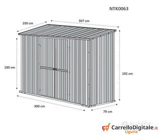 Il box prefabbricato 307 x 100 viene venduto nuovo con garanzia e con fattura o ricevuta fiscale. Viene consegnato all'indirizzo che ci verra' comunicato in kit di montaggio comprensivo di tutta la ferramenta necessaria a montarlo. Box garage casetta prefabbricato in lamiera di Acciaio Zincata grecata con Porta NUOVO, perfetto per il giardino usato come capanno per ricovero rimessa attrezzi. SPEDIZIONE IN TUTTA ITALIA INCLUSA NEL PREZZO * Dimensioni esterne (incluso tetto): 3.07 m (Larghezza) x 1.00 m (Lunghezza) x 1.92 m (Altezza) * Dimensioni esterne (solo perimetro): 3.07 m (Larghezza) x 0.79 m (Lunghezza) x 1.90 m (Altezza Max) * Dimensioni interne: 3.03 m (Larghezza) x 0.75 m (Lunghezza) x 1.90 m (Altezza Max) * Altezza della parete: 1.90 m * Metri Quadri: 3.07 mq * Dimensioni porta anteriore: 1.48 m (Larghezza) x 1,75 m (Altezza) (2 porte) * Spessore pannelli: 0,32 mm * Spessore profili: 0,70 mm * Peso struttura: 75 KG Ca. Telefono/Whatsapp: A soli 408 euro IVA, spedizione ed assicurazione sulla spedizione inclusi nel prezzo Possibilita' di acquisto con pagamento alla consegna (SOLO CONTANTI no assegni) Attenzione, il metallo utilizzato non e' ferro o alluminio ma acciaio zincato. Il box in acciao in questione non e' coibentato (pannelli sandwich) ma puo' essere modificato facilmente e con una spesa minima. La casetta da esterno e' composta da profili e pannelli in acciaio zingato e verniciato in maniera da poter resistere alle intemperie. A differenza di quelli in legno i box in lamiera zincata non necessitano di nessuna manutenzione Telefono/Whatsapp: