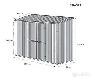 Dimensioni esterne (incluso tetto): 3.07 m (Larghezza) x 1.00 m (Lunghezza) x 1.92 m (Altezza)