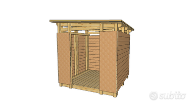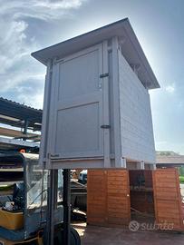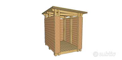 Casetta in legno per rimessa legna, pellets, attrezzi da giardino, animali, scooter, moto, bici, ecc. ecc.. possibilità di carico della stessa con carrello elevatore, predisposizione dei ganci superiori per carico con autogru, possibilità di movimentazione con transpallets, misura 200x150x 210 h circa, all' interno è possibile stipare circa 5/6 mc steri di legna sfusa. Robusta struttura portante con 15 montanti in legno lamellare, copertura realizzata con pannelli fenolici da 1.8/2 cm, guaina ardesiata e conversa di rifinitura sui 4 lati, porta realizzata con pannello fenolico da 1.8/2 cm.