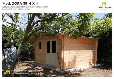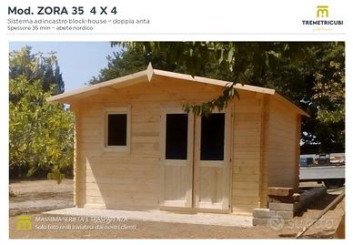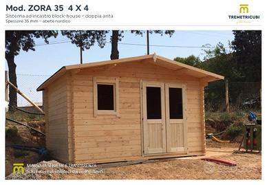 Casetta in legno dimensioni mt 4 x 4 spessore 35mm, abete nordico trattato con antitarlo ed antimuffa, sistema ad incastro blokhouse, tetto a doppia falda.