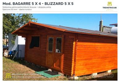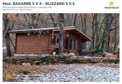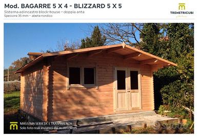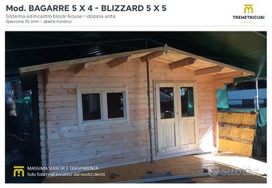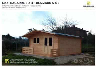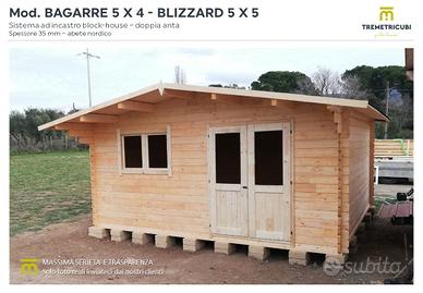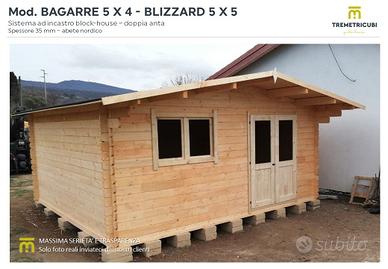 Casetta in legno dimensioni mt 5 x 5 spessore 35mm, abete nordico trattato con antitarlo ed antimuffa, sistema ad incastro blokhouse, tetto a doppia falda.