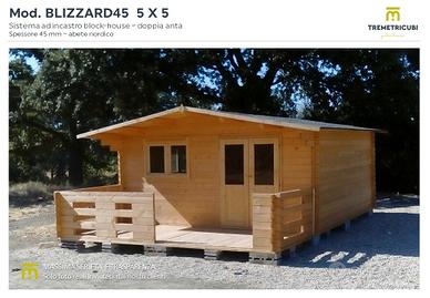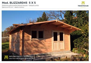 Casetta in legno dimensioni mt 5 x 5 spessore 45mm, abete nordico trattato con antitarlo ed antimuffa, sistema ad incastro blokhouse, tetto a doppia falda.
