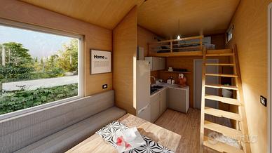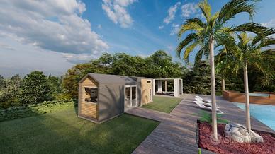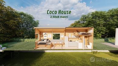 Modello casetta da giardino anche per terreni agricoli Coco House. Disponibile in consegna rapida, dotata di soppalco, bagno, zona living+ cucina. Esternamente caratterizzata da legno a vista semplice alternato a tecnica shou shugi ban.
