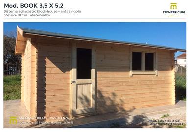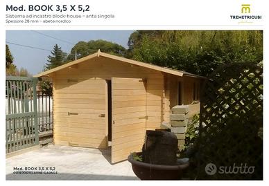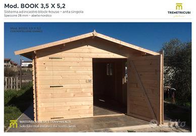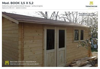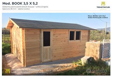 Casetta in legno o garage dimensioni mt 3,5 X 5,2 spessore 28mm, abete nordico trattato con antitarlo ed antimuffa, sistema ad incastro blokhouse, tetto a doppia falda.