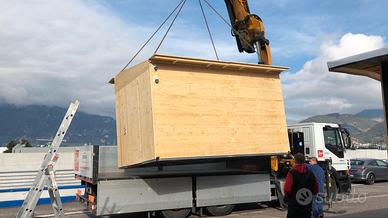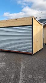 casetta in legno con struttura in ferro zincato porte laterali ,chiusa davanti con serranda manuale . Misura 4metri per 2 metri e cinquanta .