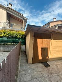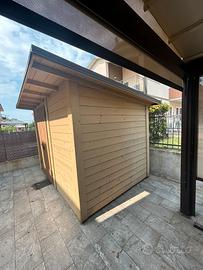 Casetta in legno 3*3, altezza 200 cm. Prezzo nuova 4.000€. Si vende gia smontata per trasloco, necessita solo di nuovo telo per la copertura superiore a causa smontaggio. Vero legno. Ririto in loco