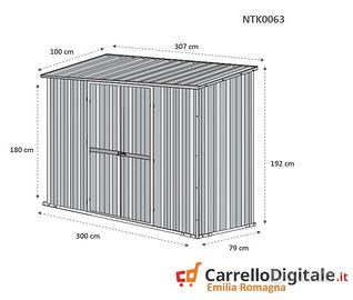 Il box prefabbricato 307 x 100 viene venduto nuovo con garanzia e con fattura o ricevuta fiscale. Viene consegnato all'indirizzo che ci verra' comunicato in kit di montaggio comprensivo di tutta la ferramenta necessaria a montarlo. Box garage casetta prefabbricato in lamiera di Acciaio Zincata grecata con Porta NUOVO, perfetto per il giardino usato come capanno per ricovero rimessa attrezzi. SPEDIZIONE IN TUTTA ITALIA INCLUSA NEL PREZZO * Dimensioni esterne (incluso tetto): 3.07 m (Larghezza) x 1.00 m (Lunghezza) x 1.92 m (Altezza) * Dimensioni esterne (solo perimetro): 3.07 m (Larghezza) x 0.79 m (Lunghezza) x 1.90 m (Altezza Max) * Dimensioni interne: 3.03 m (Larghezza) x 0.75 m (Lunghezza) x 1.90 m (Altezza Max) * Altezza della parete: 1.90 m * Metri Quadri: 3.07 mq * Dimensioni porta anteriore: 1.48 m (Larghezza) x 1,75 m (Altezza) (2 porte) * Spessore pannelli: 0,32 mm * Spessore profili: 0,70 mm * Peso struttura: 75 KG Ca. Telefono/Whatsapp: A soli 408 euro IVA, spedizione ed assicurazione sulla spedizione inclusi nel prezzo Possibilita' di acquisto con pagamento alla consegna (SOLO CONTANTI no assegni) Attenzione, il metallo utilizzato non e' ferro o alluminio ma acciaio zincato. Il box in acciao in questione non e' coibentato (pannelli sandwich) ma puo' essere modificato facilmente e con una spesa minima. La casetta da esterno e' composta da profili e pannelli in acciaio zingato e verniciato in maniera da poter resistere alle intemperie. A differenza di quelli in legno i box in lamiera zincata non necessitano di nessuna manutenzione Telefono/Whatsapp: