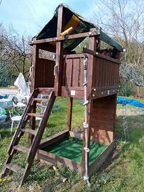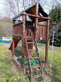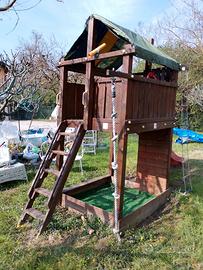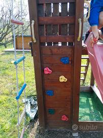 vendo casetta in legno con scivoli, palestrina di arrampicata cannocchiale e volante. occorre sostituire il telo di copertura in quanto rotto. Il legno è soggetto all'usura del tempo ma in ottime condizioni. acquistato ad un importo di 1.600 euro. possibilità di smontarlo così si vede come va rimontato... trasporto a carico dell'acquirente.