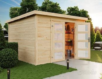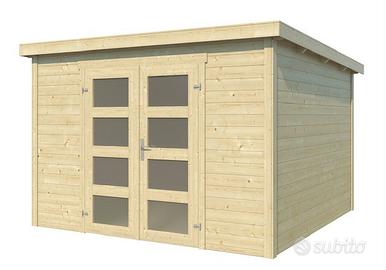Casetta blockhouse solida, spaziosa ed elegante, ideale come ricovero attrezzi,perfetta per biciclette attrezzi da giardino, ottima copertura.