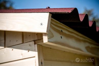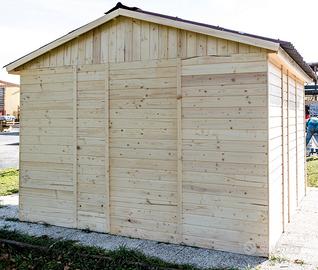 Casetta NUOVA in legno di abete grezzo non trattato dalla forma quadrata misura 2.8x2.8 metri, spessore pareti 16 mm senza pavimento interno.