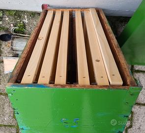 In legno e con sei telai per ospitare il lavoro delle api che stoccano il miele e chiudono le celle producendo loro una cera sigillante, uno dei fenomeni più particolari della natura. La casetta è come nuova, cioè mai usata. Compreso nel prezzo un affumicatore per gestire gli sciami durante il lavoro di estrazione dei telai col miele, la maschera di protezione del viso e una cinquantina di vasetti puliti per posare il miele prima del consumo e della vendita.
