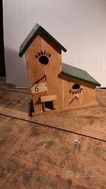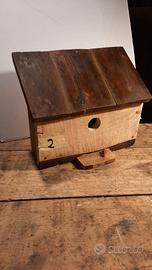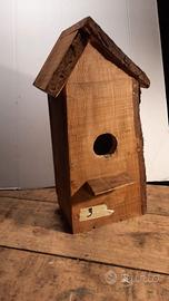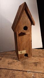 Casette per uccelli in legno, fatte a mano. N.1: Base 16x18 h. 37 con inserti in radica di noce e apertura frontale - € 25 N.2: Base 12x38 h.26 - trattamento legno con impregnante e olio di lino cotto - € 20 N.3: Base 16x21 h.46 - legno con impregnante e olio di lino cotto - € 20 N.4: Base 14x16 h.50 - legno con impregnante e olio di lino cotto - € 20 N.5: Base 22x12 h.42 - legno con impregnante e olio di lino cotto - € 20 N.6: Base 28x17 h. 33 - trattata con impregnante e tetto verniciato - € 15