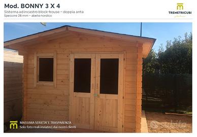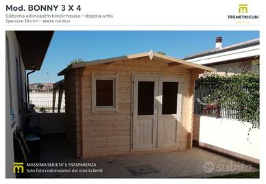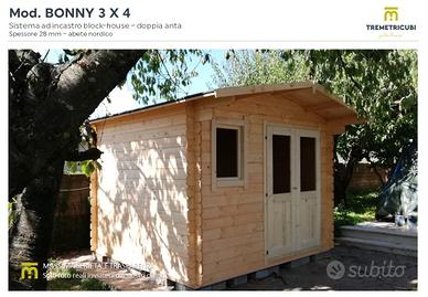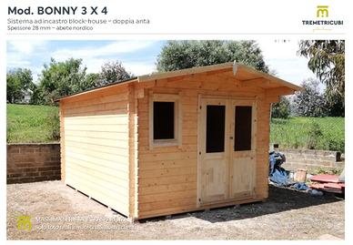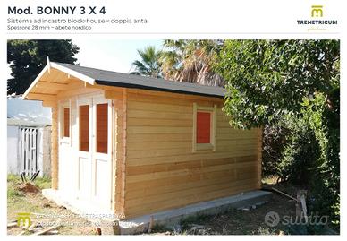 Casetta in legno dimensioni mt 3 x 4 spessore 28mm, abete nordico trattato con antitarlo ed antimuffa, sistema ad incastro blokhouse, tetto a doppia falda.