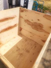 legno bianco con agganci in metallo, la cassa é leggere e può essere spostata anche a mano, tiene fino a 1000kg, può essere spostata anche con transpallet o muletto come i pallet, vendo sia a privati che a aziende