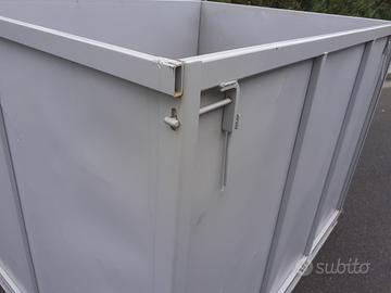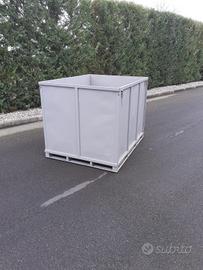 cassa metallica ripieghevole, facilissima da smontare. misure 146 x 112 cm altezza 110 cm i 4 lati si possono smontare facilmente. portata 800 kg per mille usi ne ho più di una. utile per mettere materassini, salvagenti ecc...