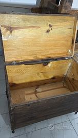 Vendo cassapanca antica perfettamente integrata tieni la struttura solida com incastri maschio femmina piedi in ferro . Non presenta fori di tarlo ma necessita di una ravvivata se si vuole lasciarla con i segni del passato . Spedizione a carico del compratore prezzo trattabile