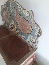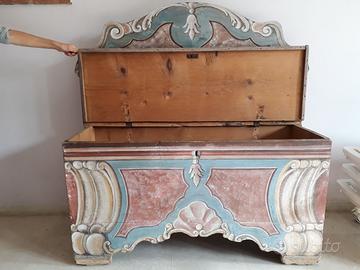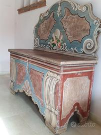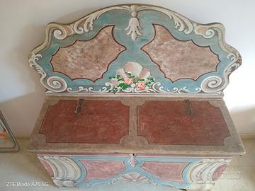 Magnifica cassapanca veneta, in legno di abete dipinto, di fine 1700, con schienale sagomato. L’oggetto, di grande pregio, è stato completamente restaurato nella struttura e nel colore da professionista, negli anni 1990. I colori pastello, le finiture, i finti marmi, la rendono un oggetto di grande eleganza, ideale per ville antiche o porticati. L’interno è capiente e può essere utilizzato per riporre giochi o elementi da giardino. Misure: 136 x 50 x h.141 cm Il ritiro è a carico esclusivo dell’acquirente. In buonissime condizioni di conservazione. Lo schienale è stato rinforzato con l'aggiunta di due tasselli (che possono essere rimossi). Pittura ottimamente restaurata da professionista.
