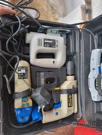 Cassetta datata con elettroutensili. Flessibile Trapano Avvitatore Seghetto alternativo Pialla