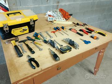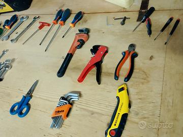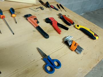 vendo cassetta attrezzi lavoro composta da due set di chiavi dalla n8 alla n17+ 1 Beta n13 con selettore di verso , 1 tronchesina, 1 pinza, 1 chiave inglese , 1 taglierino Stanley, 2 martelli, giraviti , set chiavi stella DeWalt, 3 prolunghe da 15 m CAD tutto in blocco tutto come da foto