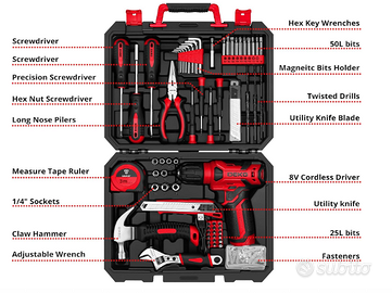 Strumenti essenziali per la casa - Questo set di utensili elettrici professionali per la casa contiene gli strumenti di progettazione, manutenzione o manutenzione più pratici e avanzati. È molto adatto per decorazione, assemblaggio di mobili, perforazione, taglio, giardinaggio, ufficio o manutenzione domestica quotidiana. Gli utensili sono accuratamente conservati in una scatola robusta per mantenerli sicuri, puliti, ordinati e facili da trovare