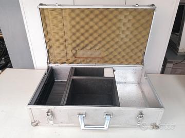Corpo e maniglia in alluminio, rinforzi angolari antiurto, due chiusure, 3 cerniere di apertura, braccetti di apertura, scomparti interni