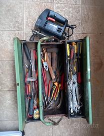 cassetta per attrezzi con varie chiavi, pinze,cacciaviti,martello,ed altro 100 euro per il lotto incluso anche seghetto alternativo blachendeker e un trapano a manovella,inoltre smeriglietto ha batteria dewolt 18 volt funzionante ma manca il caricabatterie va bene anche quello dellavitatore dewolt puche 18 volt euro 80 ,inoltre trapano con supporto ha colonna, smerigliietto elettrico prezzi da concordare per informazioni contattare posso spedire in tutta Italia spedizione ha parte