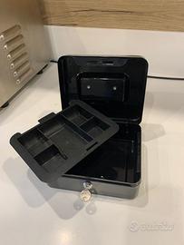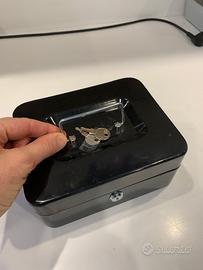 Cassettina di sicurezza portatile, ideale per la gestione depiccoli fondi cassa nelle attività. Dotata di un contenitore superiore nel quale mettere le monete sfuse e di un capiente vano inferiore nl quale riporre rotoli di moneta e banconote. Dimensioni 20x 16x 9 cm. completa di due chiavi.