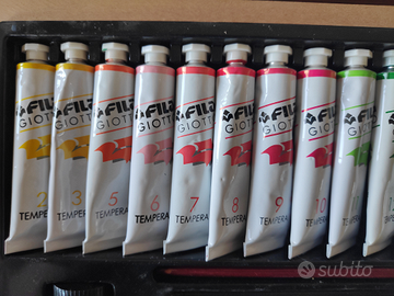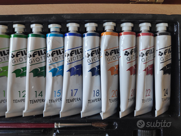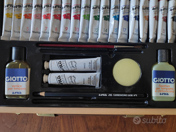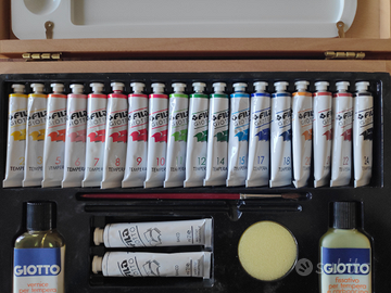 Cassetta in legno con tempere Giotto, poco usata, contenuto: 1 tavolozza, 18 tubetti colori misti, 2 tubetti colore bianco, 1 flacone vernice per tempera, 1 flacone fissativo per tempera e carboncino, 1 pennellino, 1 spugna e 1 matita carboncino