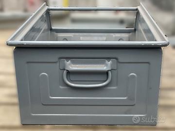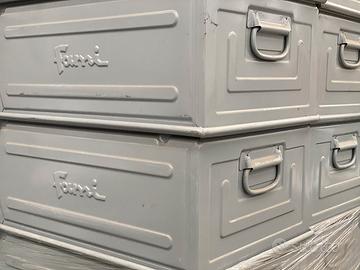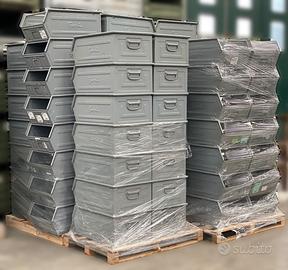 Cassette a bocca di lupo in acciaio verniciato per minuteria pesante marca Fami modello 5. Sono accatastabili ad incastro ed hanno il traversino frontale e la maniglia posteriore per la presa manuale. Servono per lo stoccaggio e la disposizione di componentistica anche pesante. Sulla parte frontale hanno il porta etichette. Usato di ottima qualità pari al nuovo. Misure: mm mm 700 x 450 h300, tara 18kg. Disponiamo di altre tipologie di cassette. Prezzo su richiesta in base alle quantità, proposta salvo il venduto e possibilità di gestione della spedizione.