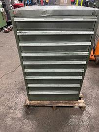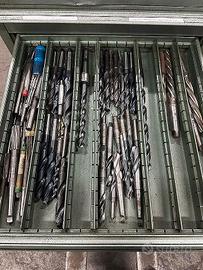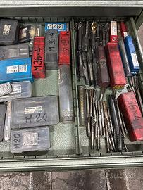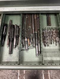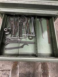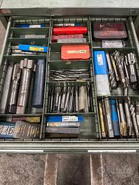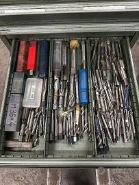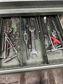 Cassettiera a 9 cassetti con: 347 maschi da 6 a 65 mm, 40 punte a baionetta, 77 alesatori, 6 alesatori regolabili, 17 filiere, gira maschi, gira filiere, varie chiavi, 2 calibri