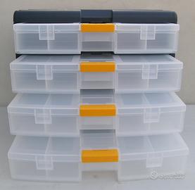 Porta minuteria modulare e trasportabile, con maniglia ergonomica a scomparsa dotata di 4 cassetti organizers trasparenti a 9 scomparti, con coperchio e chiusura brevettata, rimovibili e trasportabili separatamente. Misure esterne; valigetta cm L39xP29xH33, cassetto porta minuteria cm L35,5xP28,5xH6,5.