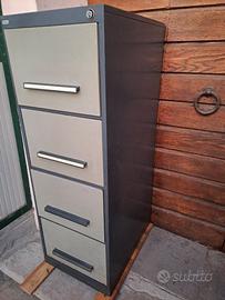 Cassettiera in metallo, compatta e robusta, a 4 cassetti. Misure: altezza cm 129,5 larghezza cm 46 e profondità cm 62,5. L'origine del mobile è per uso ufficio quale schedario a cartelle appese. Ma reimpiegabile (per esperienza diretta) quale contenitore capiente per dare ordine e riunire in unico pratico mobile piccole attrezzature, barattoli di vernice e solventi e materiali vari per officina, laboratori, falegnameria e edilizia.