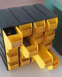 in mezzo Cassettiera colore GIALLO, 16 cassettini con vano frontale porta etichetta, dimensioni complessive 21(L)x12(P)x20(H);