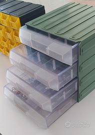 ultima TERRY PLASTIC Cassettiera porta-minuteria colore VERDE, 4 cassettini trasparenti con vano frontale porta etichetta; ogni cassetto ha la possibilità di separatori interni; Dimensioni complessive 21(L)x21(P)x20,5(H)cm, singolo cassetto 3,9(H)x19,5(L)x19,8(P)mm;