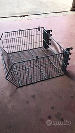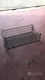Ceste in metallo di diverse misure, si possono appendere al muro si aganciano su una rete elettrosaldata, oppure alcuni modelli sono soprapponibini, sono abbastanza resistenti e ottimi per mettere articoli di minuteria il prezzo varia in base la misura e il modello partono da 5€/7€. /12€