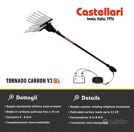 Raccogli olive elettrico professionale brevettato con pettini a doppio movimento ellittico controrotante adatti a tutti i tipi di frutti e piante. La flessibilità dei rebbi, realizzati in carbonio pultruso riduce le sollecitazioni sulle olive e sulla pianta. La particolare forma della testa di raccolta e la lunghezza dei rebbi consentono di raccogliere anche le olive più interne alla pianta. Il motore posto all’estremità inferiore dell’asta è studiato per bilanciare lo strumento. L’asta telescopica è realizzata in carbonio pultruso disponibile in due misure. L’utilizzo del carbonio, in alternativa all’alluminio, riduce le vibrazione e produce un risparmio di 300 gr. di peso aumentandone la robustezza generale. Il TORNADO CARBON V3 viene fornito con un cavo di alimentazione a tenuta stagna di 15 m. e due fusibili di sicurezza.