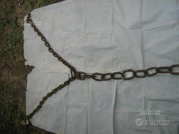 catena vecchia usata per traino di vecchi attrezzi agricoli, con gancio di attacco, composta da una parte centrale lunga cm.130 e due ramificazioni lunghe ciascuna cm.80 con i due punti di attacco distanti tra loro cm.85, la lunghezza totale è di cm.190, la parte centrale ha delle maglie ovali che misurano all'esterno cm.10x6 e spessore mm.12, i due rami laterali hanno delle maglie ovali di misura esterna cm.5x3 e spessore mm.10, peso totale kg.7, può essere ancora usata per uno sforzo massimo di circa 5 quintali, vendo a e.75, ritiro e trasporto a cario del compratore