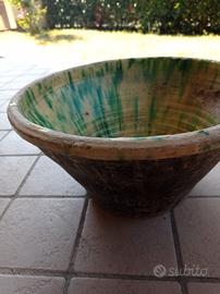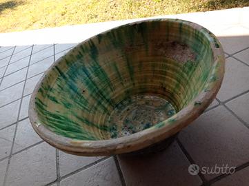Antico catino in terracotta smaltata. All'interno e sui bordi la smaltatura presenta punti danneggiati. Condizioni buone. Misure : diametro superiore cm. 49, base diametro 20,5 altezza cm 21.