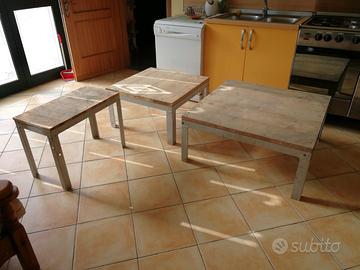Due cavalletti per tini con telaio in acciaio e tavole da 3,5cm, due tini in plastica bianca di cui uno di 700l con rubinetto e uno da 360l senza rubinetto (graduato), Quattro bidoni in acciaio inox da 50l per olio