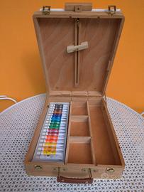 Con maniglia di trasporto e 2 chiusure. Angolo di inclinazione con regolazione continua con un gran numero di accessori: 2 tessuti di tela di 380 g/m² (Dimensioni: ca. 25 x 30 cm e ca. 30 x 40 cm, con 3 strati di primer in bianco).