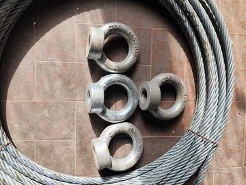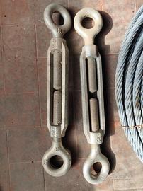 Cavo- corda d'acciaio 15 mm diametro, 30m circa di lunghezza, con tendi cavo rapporto al cavo, 4 curve per occhielli, 15 morsetti e 4 occhielli di grasse dimensioni.