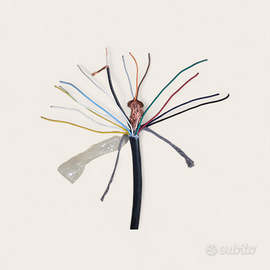 Cavo vintage gommato nero tipo videocitofono. Cavo con N. 10 conduttori da 1 mm² N. 1 coassiale e N. 3 conduttori schermati da 0,5 mm². Matassa di 30 metri al prezzo di 4,00 € al metro. Totale 120,00 €.