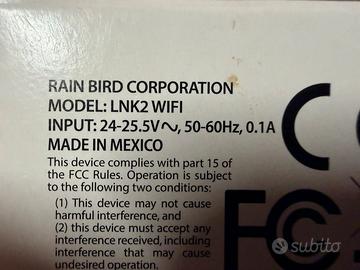 Centralina irrigazione Rain Bird ESP-RZXe + WiFi LNK2 Vendo centralina per irrigazione Rain Bird ESP-RZXe completa di modulo Wi-Fi LNK2 originale, utilizzata solo per una stagione e in condizioni ottime! Ideale per la gestione automatica dell’irrigazione del giardino, con possibilità di controllo da smartphone tramite app Rain Bird (anche da remoto). Caratteristiche principali: •Programmazione semplice e intuitiva per zone •Controllo Wi-Fi tramite modulo LNK2 incluso •Gestione irrigazione da app (iOS/Android) •Funzione automatica e manuale •Perfetta per giardini domestici Condizioni: •Usata pochissimo (1 stagione) •Perfettamente funzionante •Completa di modulo Wi-Fi originale •Come da foto Vendo per inutilizzo. 📍 Consegna a mano in zona oppure spedizione disponibile