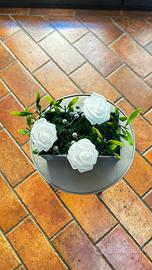 Centrotavola realizzato interamente a mano con base in legno verniciata, decorato con rose bianche, erba sintetica e bacche decorative.