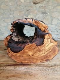 Il legno di ulivo presenta venature calde e i toni dorati e conserva la forma irregolare originale.