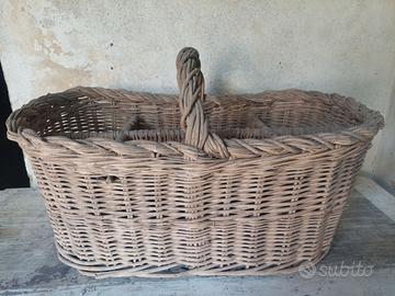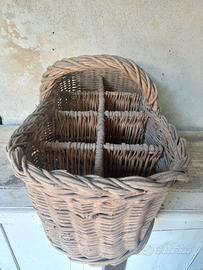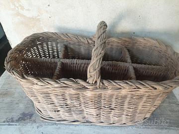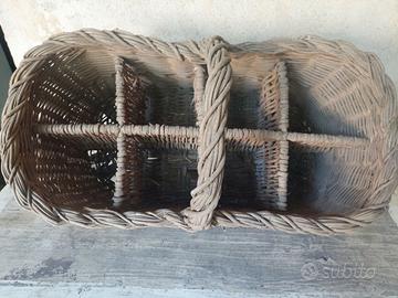 Cesta in vimini vintage, molto particolare, al tempo usata come porta bottiglioni con 8 scomparti. Parte del vimini danneggiato o mancante. Utilizzabile per uso decorativo come portavasi o simili. Dimensioni lunghezza cm 66, larghezza cm 33, altezza cm 40. Pagamento con bonifico.