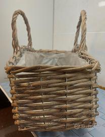 Cesta vimini cm 48 x 20 x 26 altezza alla maniglia. Internamente plastificata per riporre piantine in piccoli vasi o qualsiasi altro uso. Interno alto 11 cm nel punto più basso. Ottimamente tenuta, non ci sono pezzi rotti o ammaccati. Richiesta 8 euro.