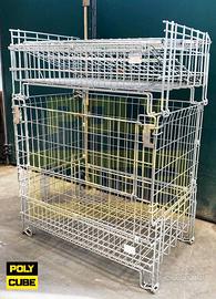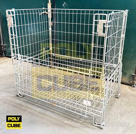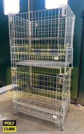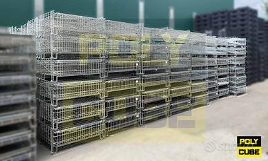 Contenitori o ceste formato cm 120x80 in filo metallico zincato. Sono richiudibili per ottimizzare la logistica di ritorno e lo spazio magazzino, sono accatastabili tra di loro sia da aperti che da chiusi ed hanno un’anta apribile sul lato lungo che permette il prelievo del materiale anche quando sono impilati. Lotto di OTTIMA QUALITA’ come da documentazione fotografica. Misure max ingombro: cm 120 X 80 H112 Misure da chiusi: cm 120 X 80 H48 Misure interne: cm 112 X 78 H96
